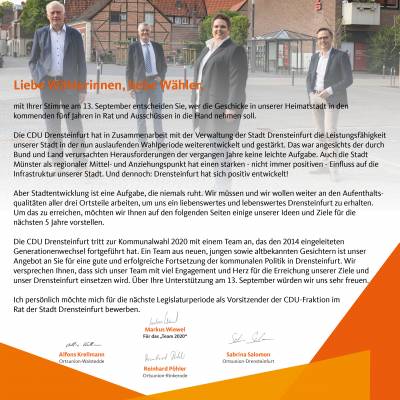 Der hier abgebildeten CDU-Wahlflyer bringt Ihnen unsere Direktkandidatinnen und -kandidaten sowie unsere Ideen und Ziele schon einmal näher. In den nächsten Wochen werden wir Ihnen diesen auch persönlich aushändigen. Die CDU in Drensteinfurt steht für eine kompetente und bürgernahe Kommunalpolitik.
