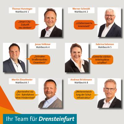 Die CDU Drensteinfurt tritt zur Kommunalwahl 2020 mit einem Team an, das den 2014 eingeleiteten Generationenwechsel fortgeführt hat. Ein Team aus neuen, jungen sowie altbekannten Gesichtern ist unser Angebot an Sie für eine gute und erfolgreiche Fortsetzung der kommunalen Politik in Drensteinfurt.