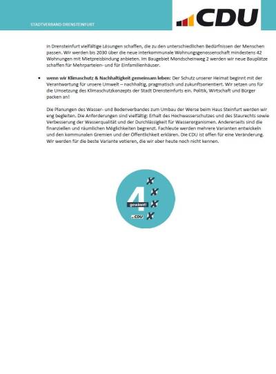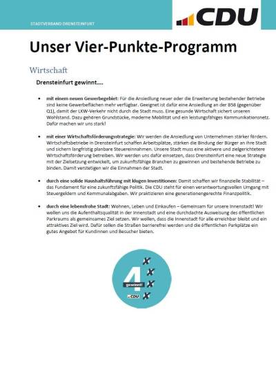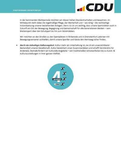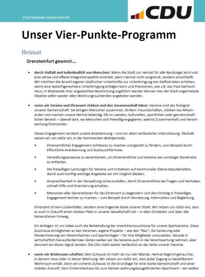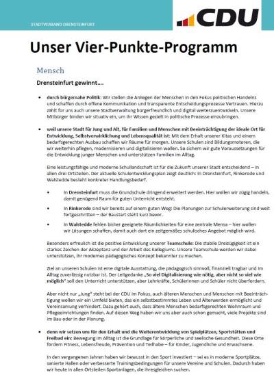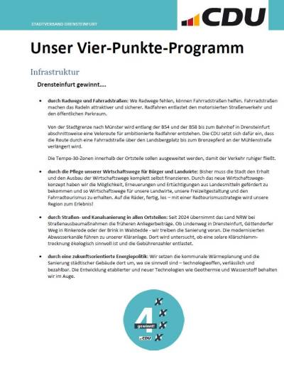 Für die CDU und Markus Wiewel ist unser Vier-Punkte-Programm klar: Mensch, Heimat, Wirtschaft und Infrastruktur – denn 4 gewinnt!