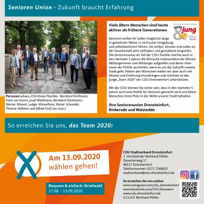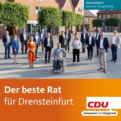 Die CDU Drensteinfurt tritt zur Kommunalwahl 2020 mit einem Team an, das den 2014 eingeleiteten Generationenwechsel fortgeführt hat. Ein Team aus neuen, jungen sowie altbekannten Gesichtern ist unser Angebot an Sie für eine gute und erfolgreiche Fortsetzung der kommunalen Politik in Drensteinfurt.