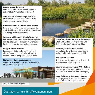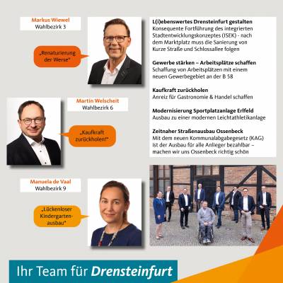 Der hier abgebildeten CDU-Wahlflyer bringt Ihnen unsere Direktkandidatinnen und -kandidaten sowie unsere Ideen und Ziele schon einmal näher. In den nächsten Wochen werden wir Ihnen diesen auch persönlich aushändigen. Die CDU in Drensteinfurt steht für eine kompetente und bürgernahe Kommunalpolitik.